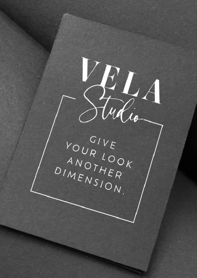 Ein souveräner Auftritt in kühlem Schwarz-Weiß setzt das Branding für VELA selbstbewusst in Szene. Die puristische Typografie und feine Akzente veredeln den extravaganten Look. Dazu setzt der entwickelte claim „Give your look another dimension.“ ein klares Fashion-Statement.